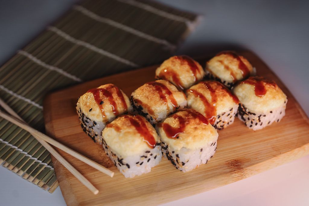 Ролл с начинкой из тигровой креветки, огурца,лосося ,в кунжуте, запеченный под сырной шапочкой.