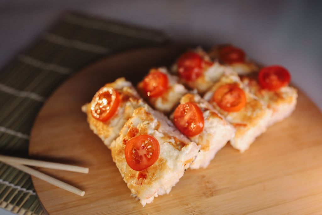 СУШИ-ПИЦЦА С КУРИЦЕЙ,ПОМИДОРАМИ,ЗЕЛЕНЫМ ЛУКОМ И СЫРНЫМ СОУСОМ! 280 ГР.