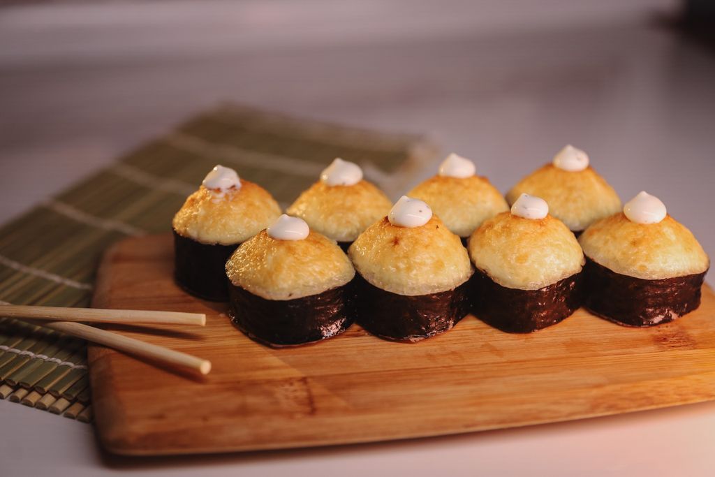 Ролл с лососем, снежным крабом,огурцом,соус для запекания.