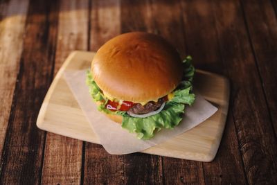 Булочка пшеничная, говяжья котлета, сырный соус Чеддер, помидор, лист салата, кетчуп, горчица.